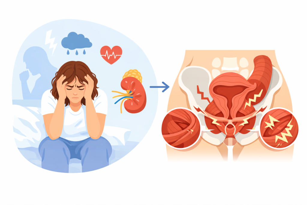 Stress hormones increase nerve sensitivity and muscle guarding. Pelvic muscles may tighten unconsciously during anxious moments, intensifying discomfort or pressure sensations.