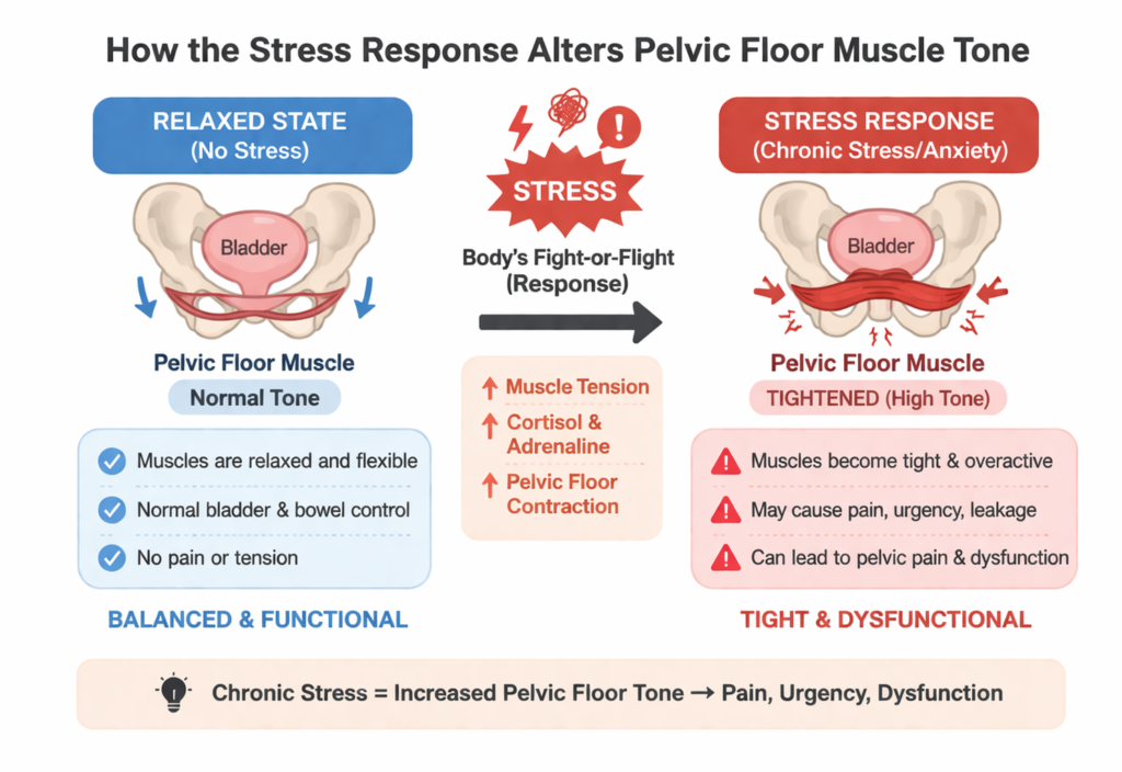 Anxiety places the body into a protective state that prepares muscles for perceived danger. Muscles across the body subtly tighten, including those deep inside the pelvis. Over time, repeated stress responses condition the pelvic floor to remain contracted even during rest. This state contributes to what clinicians describe as a Hypertonic Pelvic Floor a condition where muscles remain shortened and unable to fully relax.