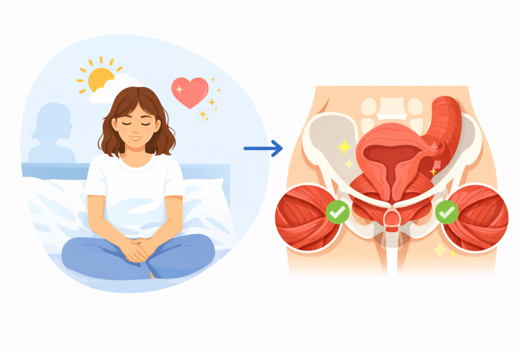 Blood flow increases as stress hormones decline. Improved circulation nourishes muscle tissue and reduces inflammatory signals. Pelvic organs function more smoothly within this environment.